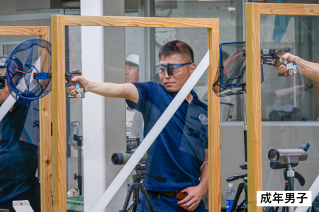 25m(センター・ファイア・ピストル)は、片手で銃を持ち、立ったままで25メートル先の標的を射撃します。精密射撃30発と速射30発の合計点で競う「CFP60」と、精密射撃30発で競う「CFP30」があります。